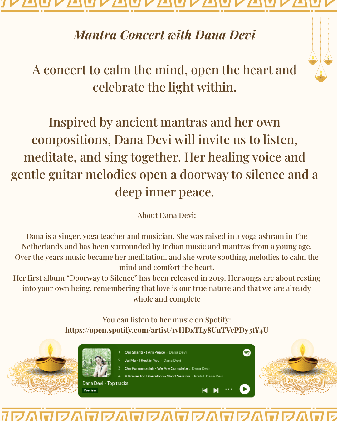 Diwali is the festival of lights. You are invited to celebrate this beautiful festival of lights at Ektara Heart, with a Mantra Concert by Dana Devi. Listen to her music here on Spotify Stay in touch for more events and workshops at Ektara Heart Sign up with your email address to receive heart updates. Email Address Sign Up Thank you! Dana Devi’s magical voice.